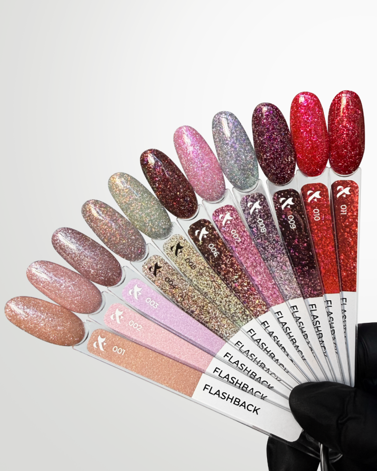 Колекцията от светлоотразяващи гел лакове F.O.X Flashback включва 11 зашеметяващи нюанса – от нежни нюд тонове до наситено тъмен черешов цвят. Всеки цвят впечатлява с изключителен блясък и силен светлоотразяващ ефект.