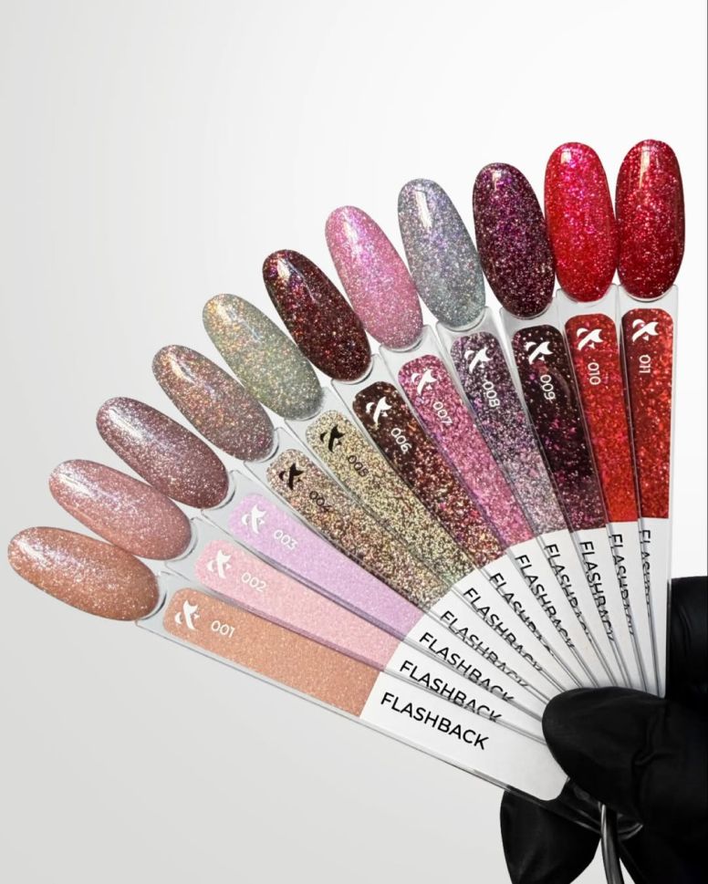 Колекцията от светлоотразяващи гел лакове F.O.X Flashback включва 11 зашеметяващи нюанса – от нежни нюд тонове до наситено тъмен черешов цвят. Всеки цвят впечатлява с изключителен блясък и силен светлоотразяващ ефект.